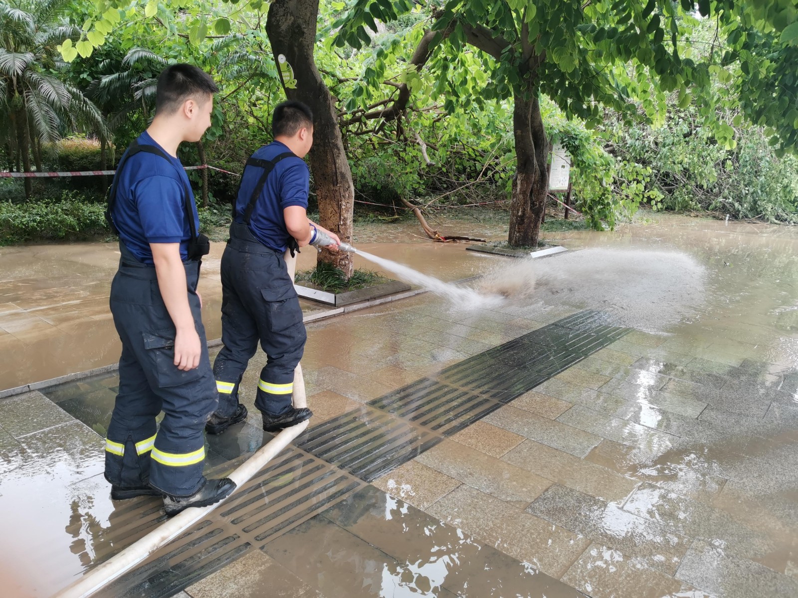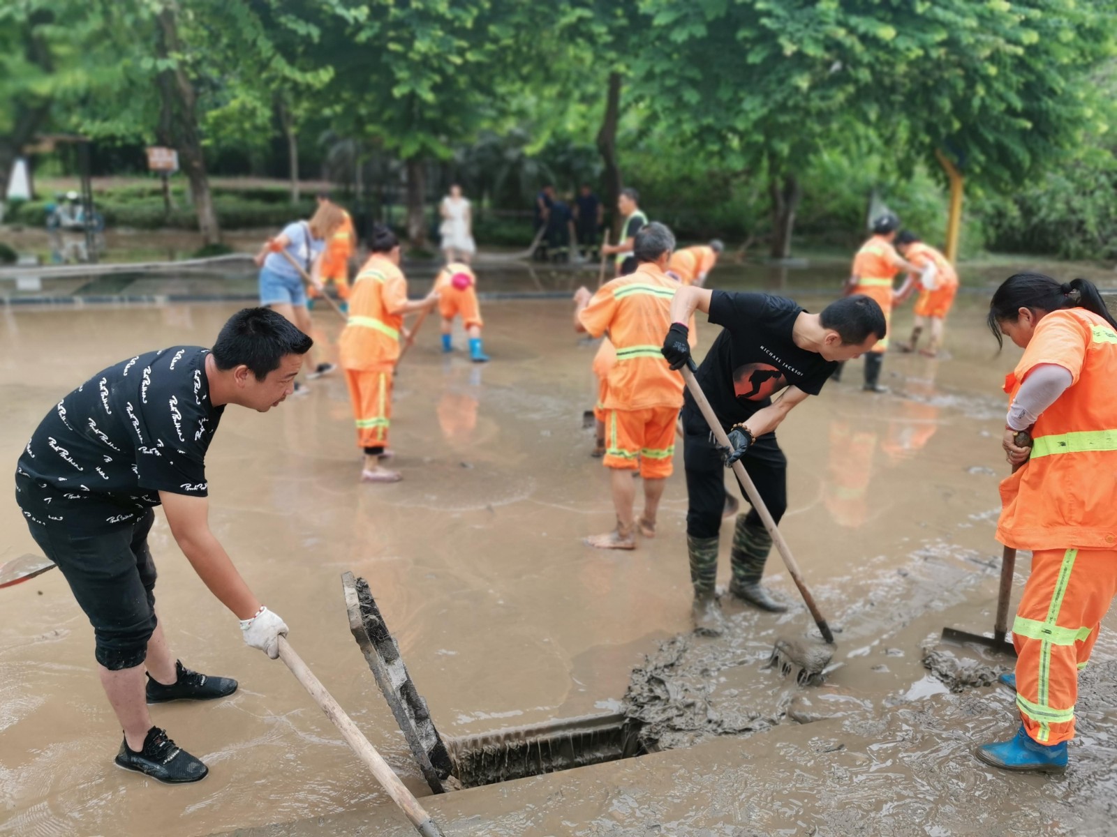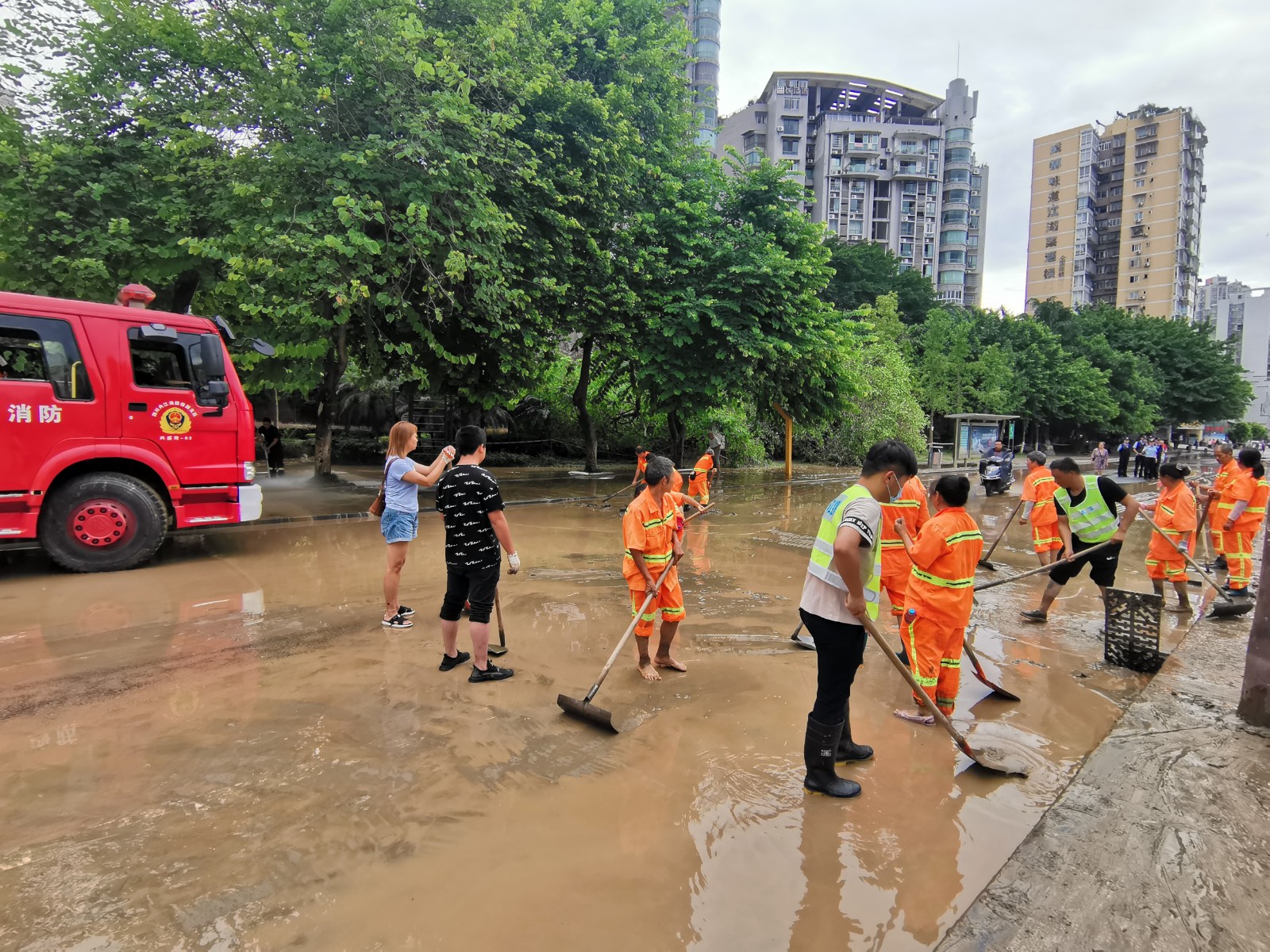 8月19日,大佛寺外临江路段,环卫工人从早上六点就开始清理淤泥,现场分为两个小组,共六十人,大水车四台,小水车六台,洗扫车两台,消防车一台。预计本路段将共清理长一公里,宽12米,厚度20厘米的淤泥。水退后还将继续清理江边的台阶。