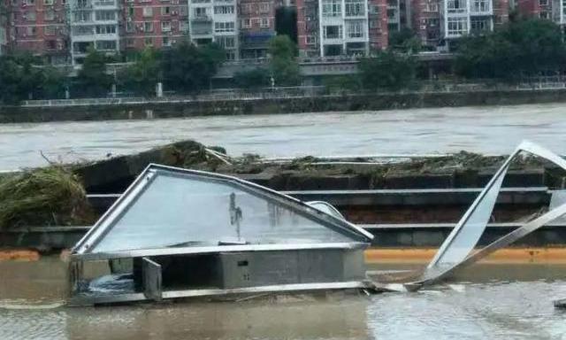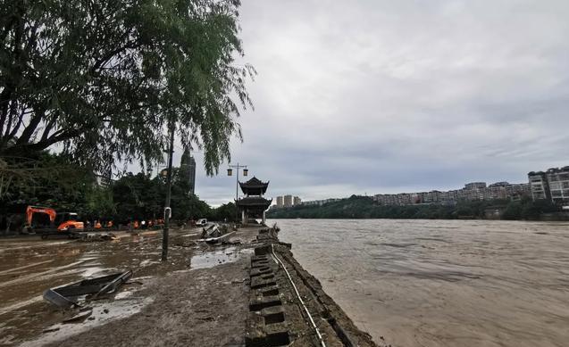 8月19日早上8时,记者在现场看到,随着洪水逐渐退去,滨江路一片狼藉,淤泥和垃圾遍地,滨江护城墙被冲毁近100米,沿路广告牌、休闲亭、绿化带植物不同程度损毁。