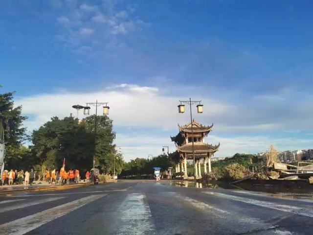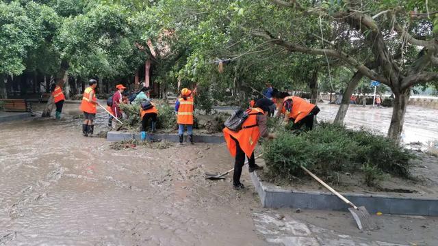 在滨江主道上,工作人员在清理绿化带里的垃圾,铲车正在对路面淤泥进行清理,洒水车对平台路面进行喷水清淤,环卫工人正在打扫没冲走的碎石杂物,整个场面有序而繁忙。
