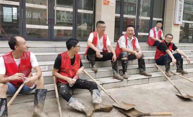 19日下午,新桥镇11名党员和志愿者支援球溪镇清淤攻坚战。