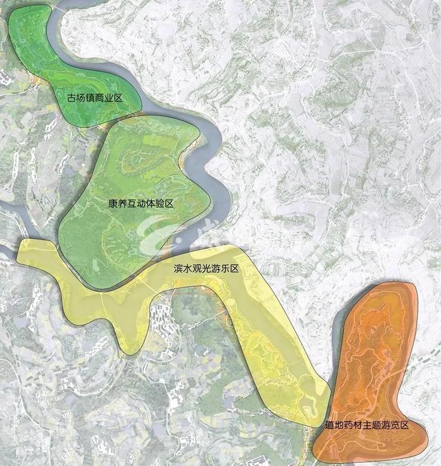 即古场镇商业区、康养互动体验区、滨水观光游乐区、道地药材主题游览区。建成后,将成为观赏游憩、体验采摘、垂钓鱼群、休闲养生、度假放松的好去处。