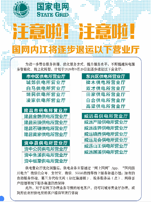 注意啦!注意啦!江粉儿从国家电网了解到,9月20日起内江这些供电营业厅将逐步退运,快看以后怎么缴电费!