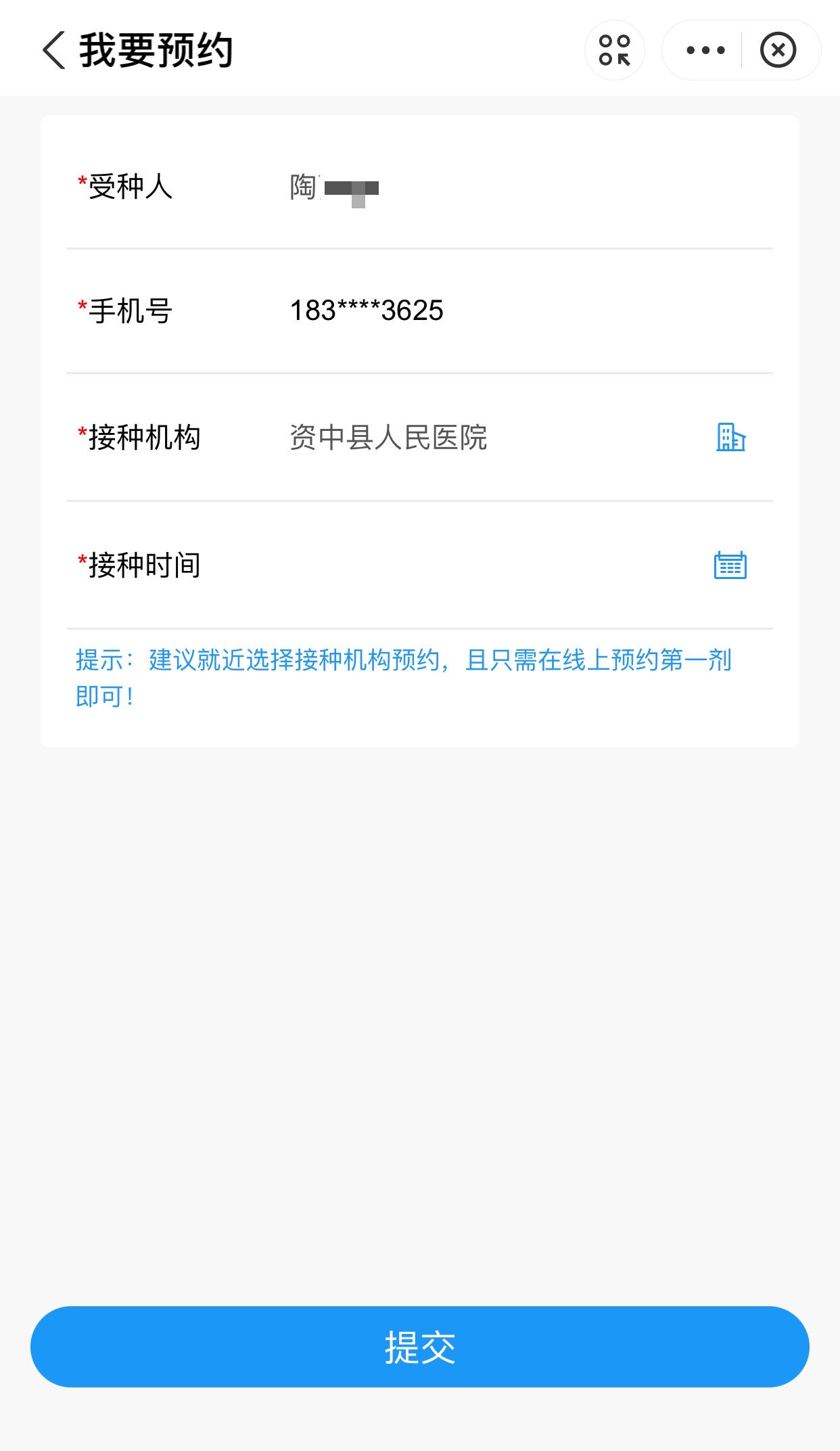第三步:如实填写姓名、联系方式,选择接种机构和接种时间