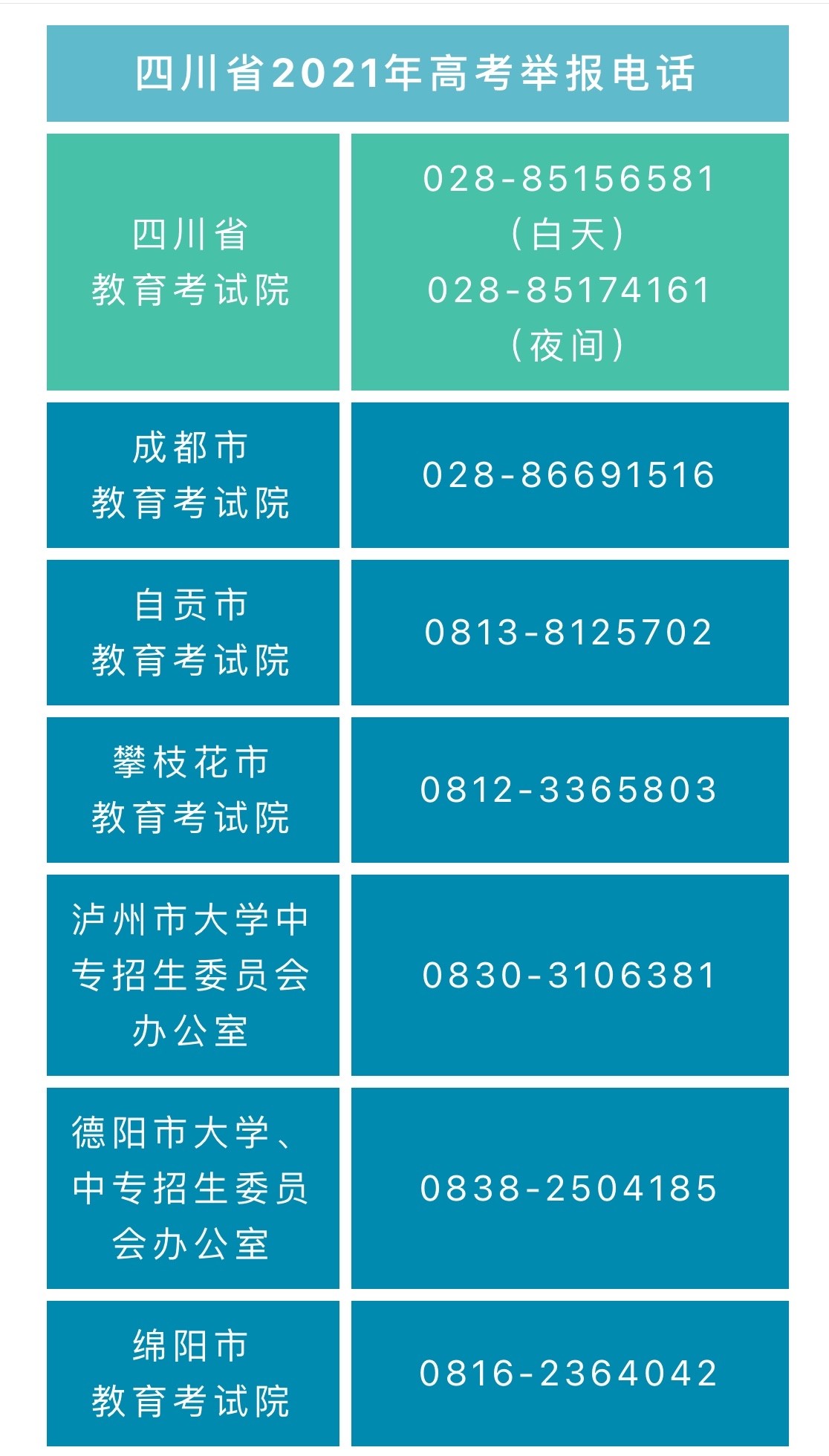 记者今天(6月3日)从四川省教育考试院了解到,高考期间(6月1日—9日),四川开通2021年高考省、市两级举报电话,欢迎广大考生、家长及社会各界人士及时举报反映涉及2021年高考的问题线索。四川省教育考试院及各市(州)招考机构将会同有关部门根据举报线索第一时间核查处理,坚决维护高考公平公正。