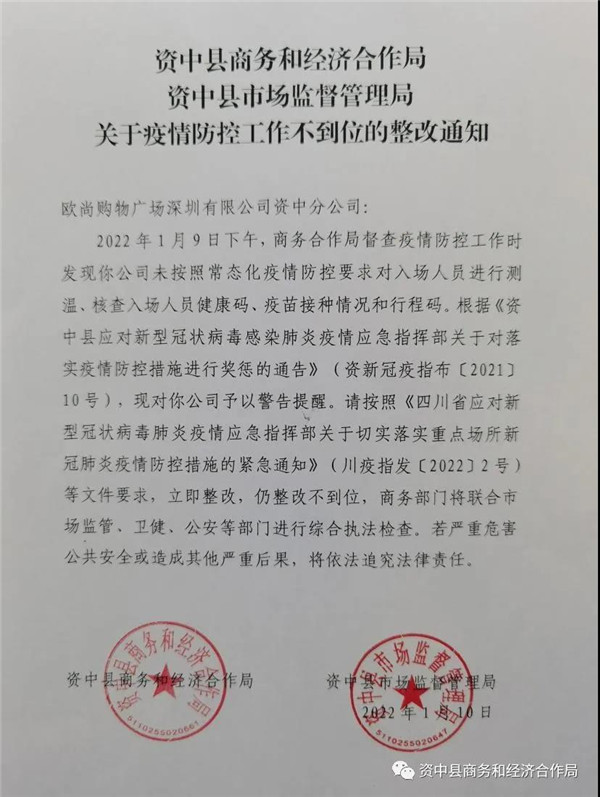 1月10日,县商务合作局会同县市场监管局按照《资中县应对新型冠状病毒感染肺炎疫情应急指挥部关于对落实疫情防控措施进行奖惩的通告》(资新冠疫指布〔2021〕10号)要求,联合向企业发出书面整改通知,告知企业若第二次发现落实还不到位的,相关责任部门将依法依规责令关停整顿。检查组对欧尚超市整改情况进行检查,目前,欧尚超市各项疫情防控措施已落实到位。