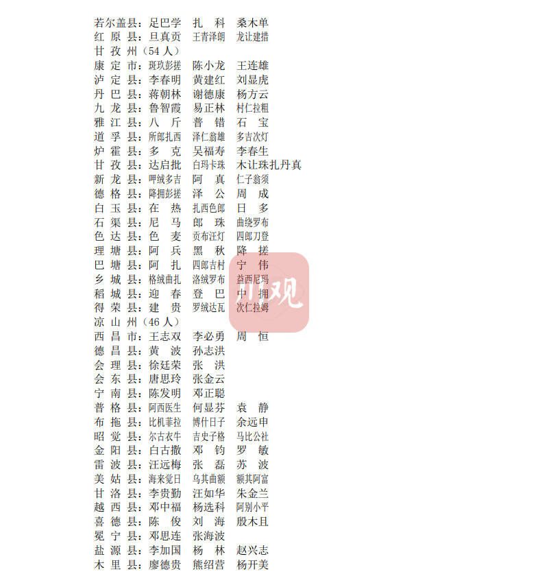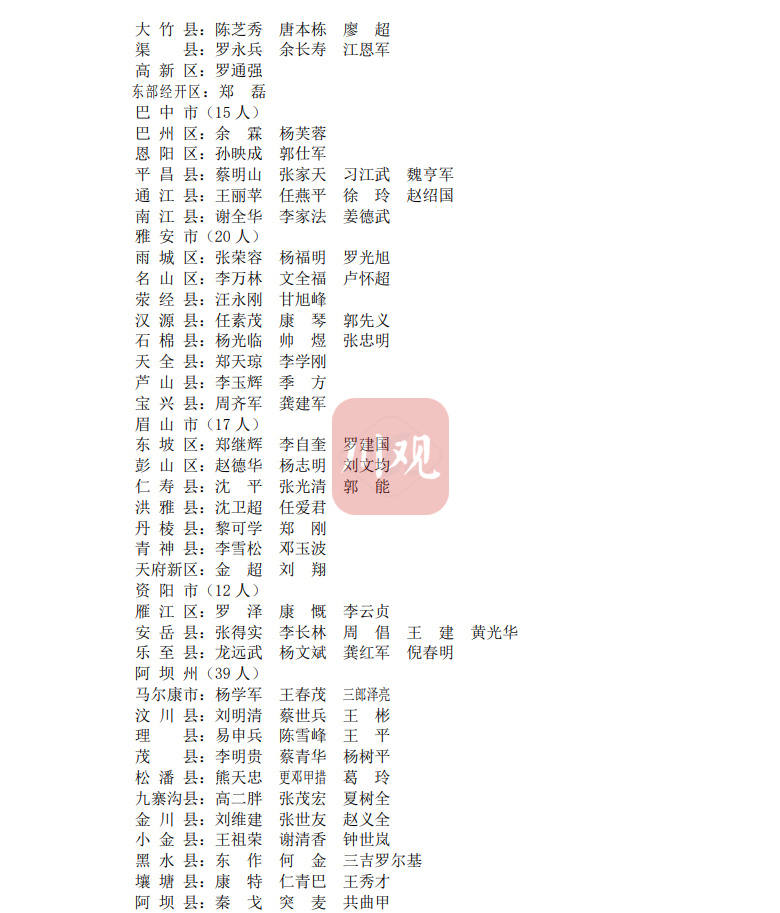 时间:2022-01-12 11:40:22 来源:川观新闻1月11日,记者从省农业农村厅获悉,四川省首批农村致富带头人名单已出炉,共有500人入选,其中,成都市34人,自贡市17人,攀枝花市12人,泸州市20人,德阳市17人,绵阳市25人,广元市20人,遂宁市15人,内江市15人,乐山市30人,南充市27人,宜宾市28人,广安市17人,达州市20人,巴中市15人,雅安市20人,眉山市17人,资阳市12人,阿坝州39人,甘孜州54人,凉山州46人。