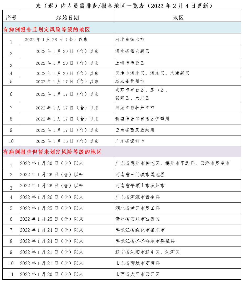 近期重点关注天津市、浙江省杭州市,广东省深圳市,北京市丰台区,黑龙江省牡丹江市,新疆维吾尔自治区伊犁州霍尔果斯市疫情。不前往高、中风险地区以及发生本土疫情的地区。如您近期有疫情地区旅居史,收到提醒短信或健康码变为“黄码”,请立即向所在社区(村)、单位或入住酒店报备旅居史,按要求做好核酸检测,配合做好各项疫情防控措施。
