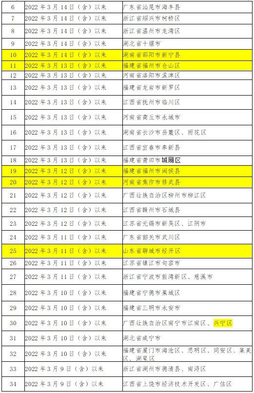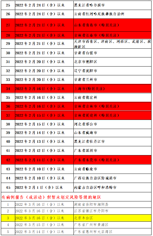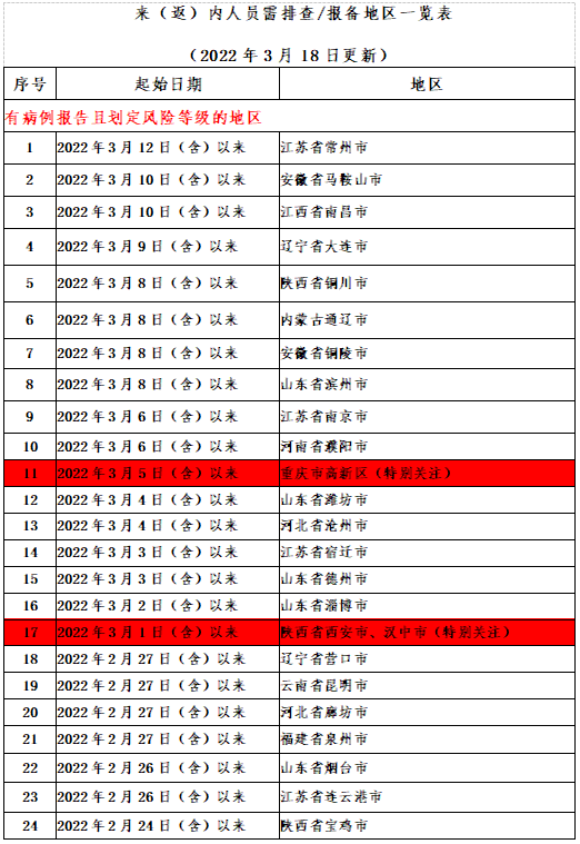 近期要重点关注重庆市、广东省东莞市、深圳市,山东省青岛市、威海市,上海市,吉林省长春市、吉林市,河北省廊坊市、沧州市,甘肃省兰州市,江苏省连云港市,天津市,陕西省西安市、宝鸡市疫情,不前往高、中风险地区以及发生本土疫情的地区。