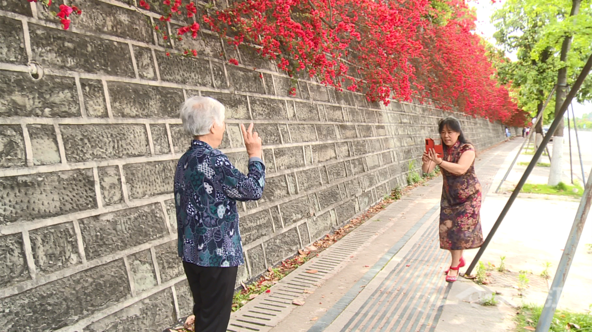 时下,三角梅进入盛花期,在内江市市中区石羊大道中段,墙边的三角梅竞相绽放,萦绕出一抹迷人的春意,吸引了众多市民前来拍照打卡。