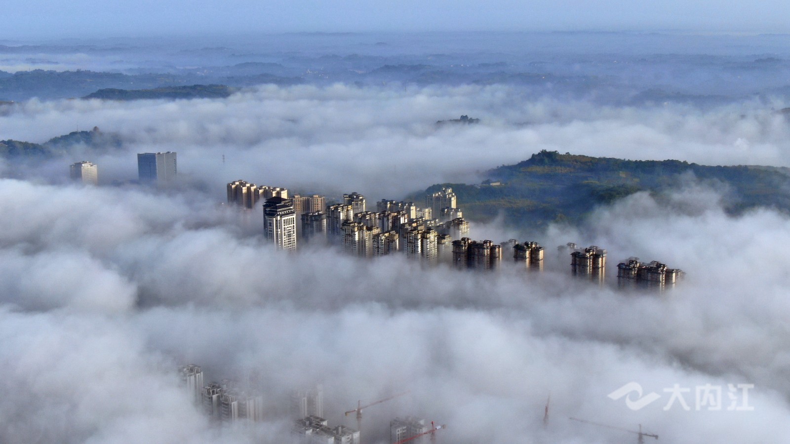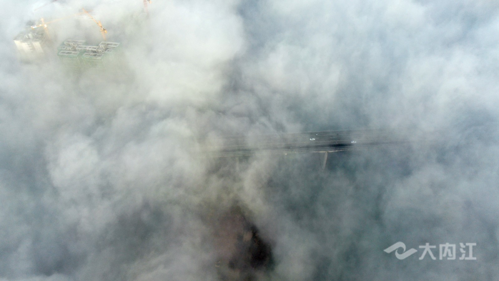 ▲晨雾渐渐散去,内江城南新区建设蒸蒸日上