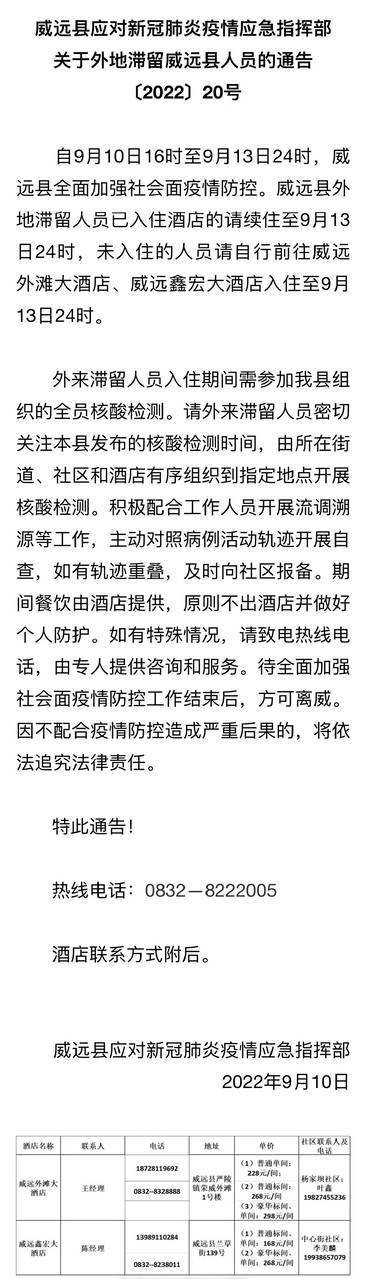 9月10日,内江市威远县发布关于外地滞留威远人员的通告,详情如下: