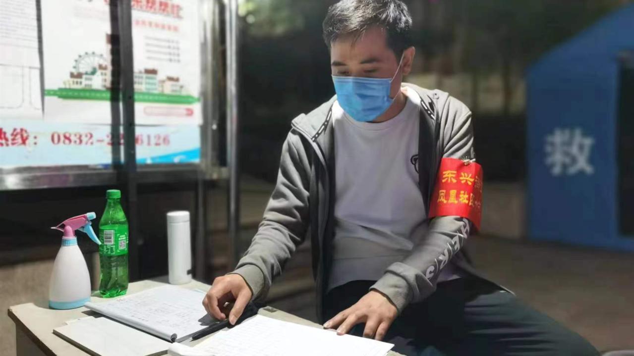 ▲内江市委网信办干部凌晨值守东兴区东兴街道凤凰社区卢浮春天小区卡点