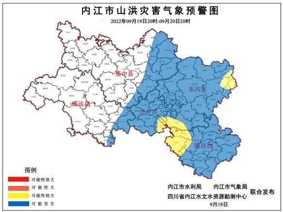 2022年9月19日20时至20日20时,市中区东南部、东兴区东部和南部、隆昌市西部发生山洪灾害可能性较大(黄色);市中区(含经开区)、东兴区(含高新区)、威远县东部、资中县东部,及隆昌市除西部以外的区域可能发生山洪灾害(蓝色),请注意防范。