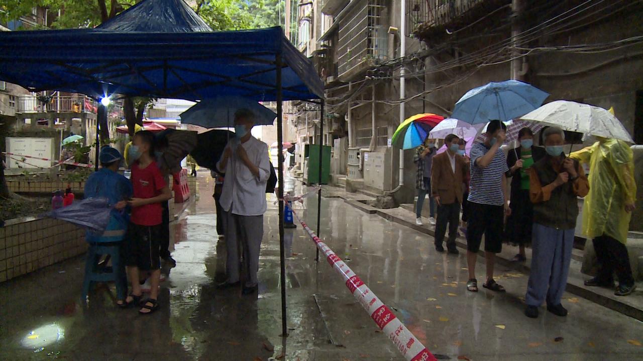 在东兴区锦绣花园小区核酸检测点,尽管天空下起了大雨,居民们在工作人员及志愿者的引导下有序下楼接受核酸采样,现场秩序井然。