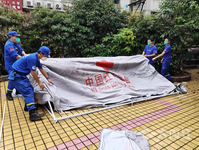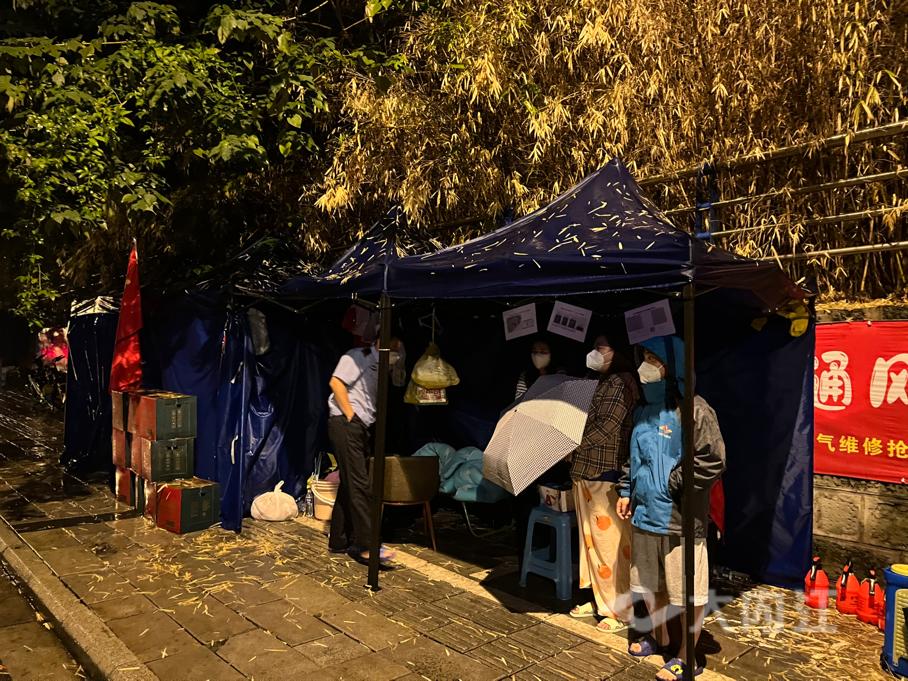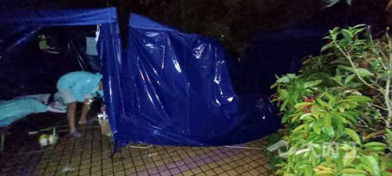 凌晨5点,下了一夜的大雨造成站点帐篷垮塌、漏雨,志愿服务队的志愿者们冒雨转移了各种物资,随后紧急修缮垮塌的帐篷。