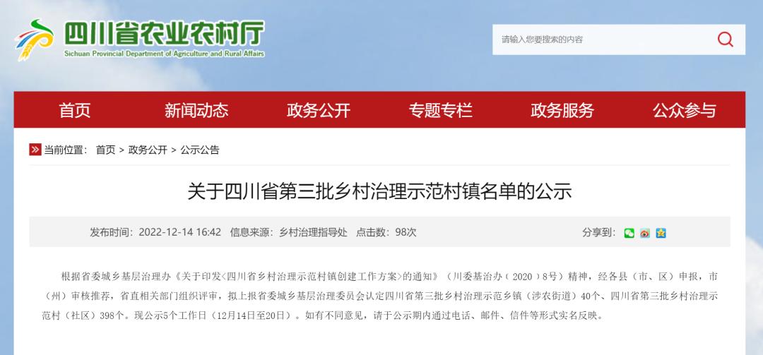时间:2022-12-15 15:42:19 来源:四川发布日前,四川省农业农村厅网站发布关于四川省第三批乡村治理示范村镇名单的公示。