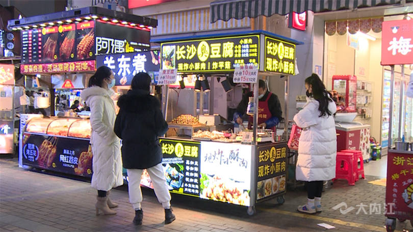 在东兴区汉安大道栖霞路口,街上的行人都佩戴着口罩。在万达金街,沿街餐饮店开门迎客,有序开放堂食,市民可自由进店就餐。同时,市民们进出万达商城也无需提供提供核酸、查验体温。