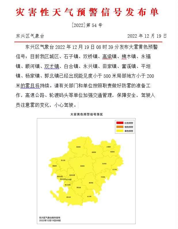 今早,东兴区气象台发布大雾黄色预警信号,详情如下: