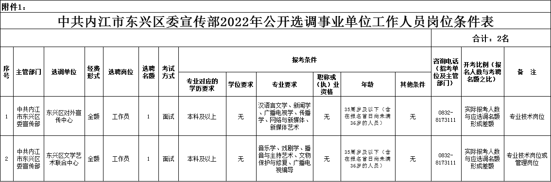 1.开考比例详见《中共内江市东兴区委宣传部2022年公开选调事业单位工作人员岗位条件表》(附件1),如达不到该开考条件的,取消该选调岗位。