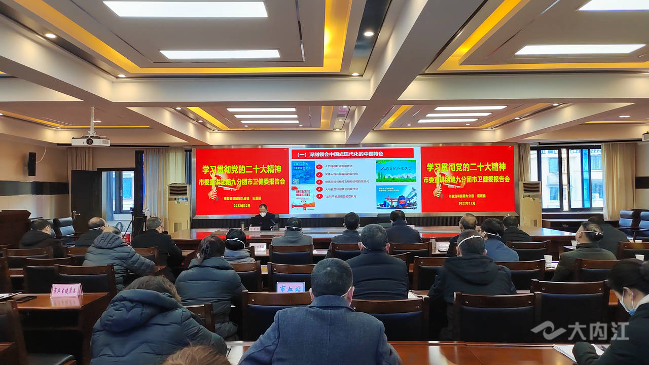 时间:2022-12-27 16:06:35 来源:内江广播电视台12月26日,内江市委宣讲团第九分团团长、市卫健委主任阮履强走进市卫生健康系统,作党的二十大精神宣讲报告。阮履强紧扣卫生健康工作实际,全面、生动、系统地解读了党的二十大报告、省委十二届二次全会和市委八届五次全会精神。宣讲报告内涵丰富,逻辑严谨,思想深刻,与会人员纷纷表示,将把学习宣传贯彻党的二十大精神和学习宣传贯彻省委、市委全会精神统筹结合,坚持学深悟透,把准会议精神实质,全力开创卫生健康事业新篇章。