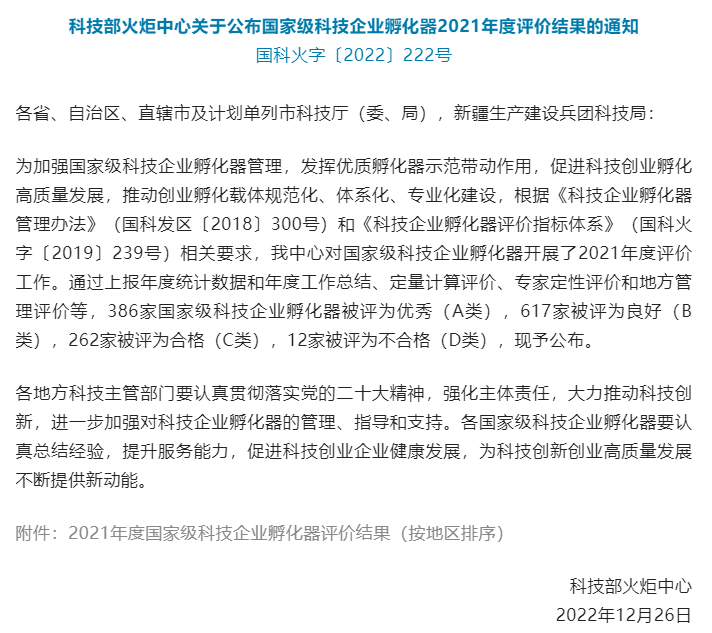 ▲点击图片查看2021年度国家级科技企业孵化器评价结果