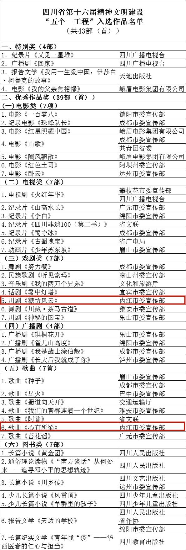 经严格评审,43部作品入选四川省第十六届精神文明建设“五个一工程”作品名单。其中由内江市委宣传部选送的川剧《糖坊风云》入选戏剧类优秀作品奖,歌曲《心有所蜀》入选歌曲类优秀作品奖。