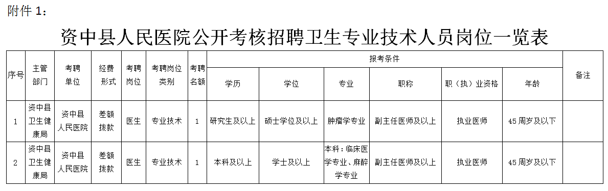 岗位要求的具体条件详见《资中县人民医院公开考核招聘卫生专业技术人员岗位一览表》(附件1)。