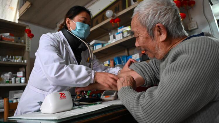 2月10日,新江社区卫生服务中心医护人员正在为老年人进行免费健康体检。(李建明 摄)