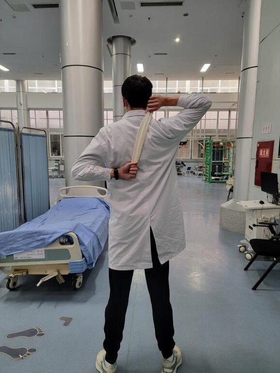 八、站立位,双手分别抓握毛巾两头,一侧上肢肩关节前屈,另一侧上肢肩关节后伸、内旋,肘关节屈曲握住毛巾另一头,类似于“搓背”运动,双上肢交替活动,30 次/ 组,4 组/天。