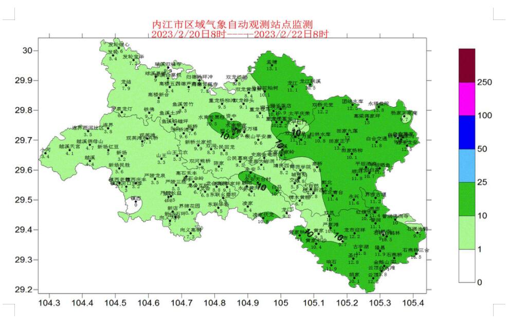 根据内江市气象台发布的雨情通报,2月20日08时至22日08时,内江市出现一次降温降雨天气过程,日平均气温下降5℃左右,西部普降小雨,东部普降中雨,累计雨量4~20毫米。全市148个观测站中10~25毫米61个,0~10毫米85个,最大降水出现在隆昌市石燕桥,累计雨量21毫米。(具体雨量见附表)