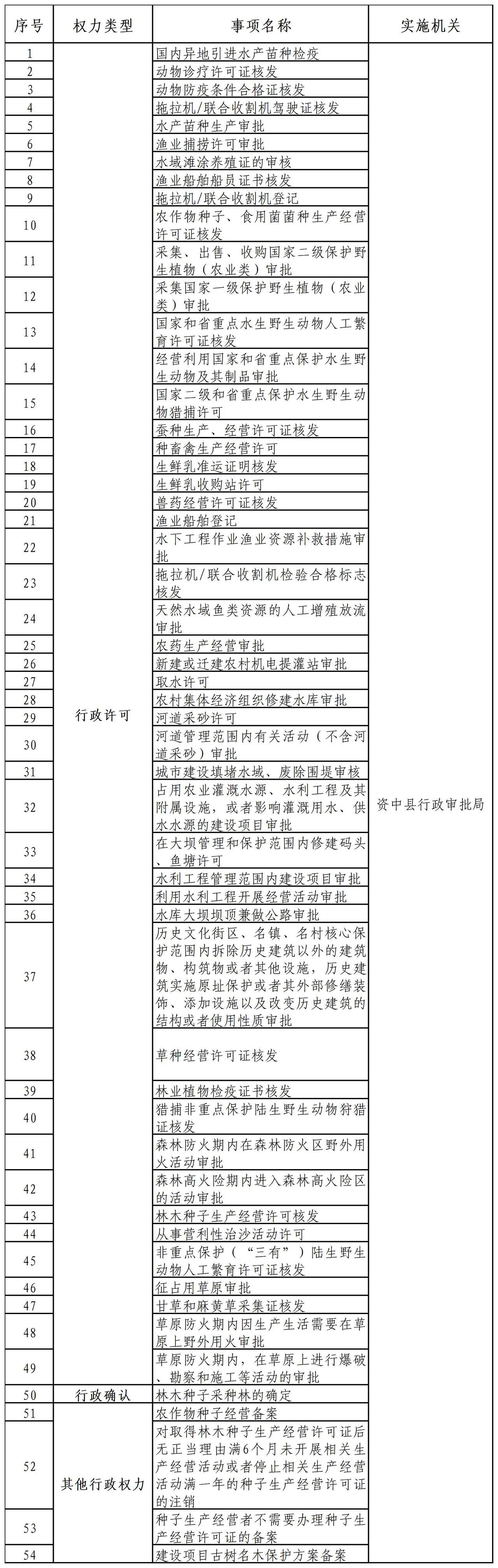为进一步简化审批流程,提高审批效率,不断优化全县营商环境,根据《中共资中县委 资中县人民政府关于印发〈资中县相对集中行政许可权改革工作实施方案>的通知》(资委办发〔2021〕73号)文件精神和相关要求,我局与县农业农村局、县水利局、县自然资源规划局等3个单位就国内异地引进水产苗种检疫、取水许可、草种经营许可证核发等49项行政许可事项、1项行政确认事项和4项其他行政权力事项共计54项事项完成划转交接。自2023年2月27日起,以上事项由县行政审批局集中办理。现将事项划转情况公告如下: