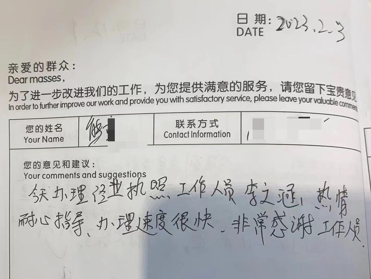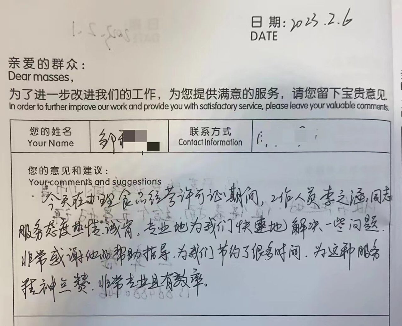 李之涵过硬的专业知识和优质的服务水平,得到了办事群众和企业的广泛认可。“来办理业务时,我们准备得很不充分,本以为会反复跑路,没想到窗口工作人员很热情地帮忙指导,并且非常专业地替我们解决了许多问题。他是真正做到了高效、规范、优质地为企业办实事!”前来政务服务中心办理食品经营的邹女士满意地说到。