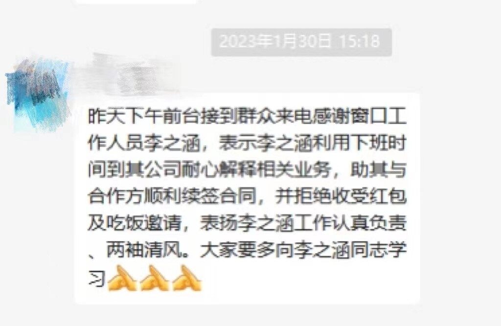 原来,在一次周末休息期间,李之涵得知前来申请食品经营许可证的某公司因暂不能办理该业务,面临与合作单位不能续签合同的困境时,他立即赶到洽谈现场,依法向双方作出了合理说明,最终该公司得到了合作方的理解。为了对李之涵表示感谢,该公司特意致电政务中心,将事情原委告知并提出表扬。