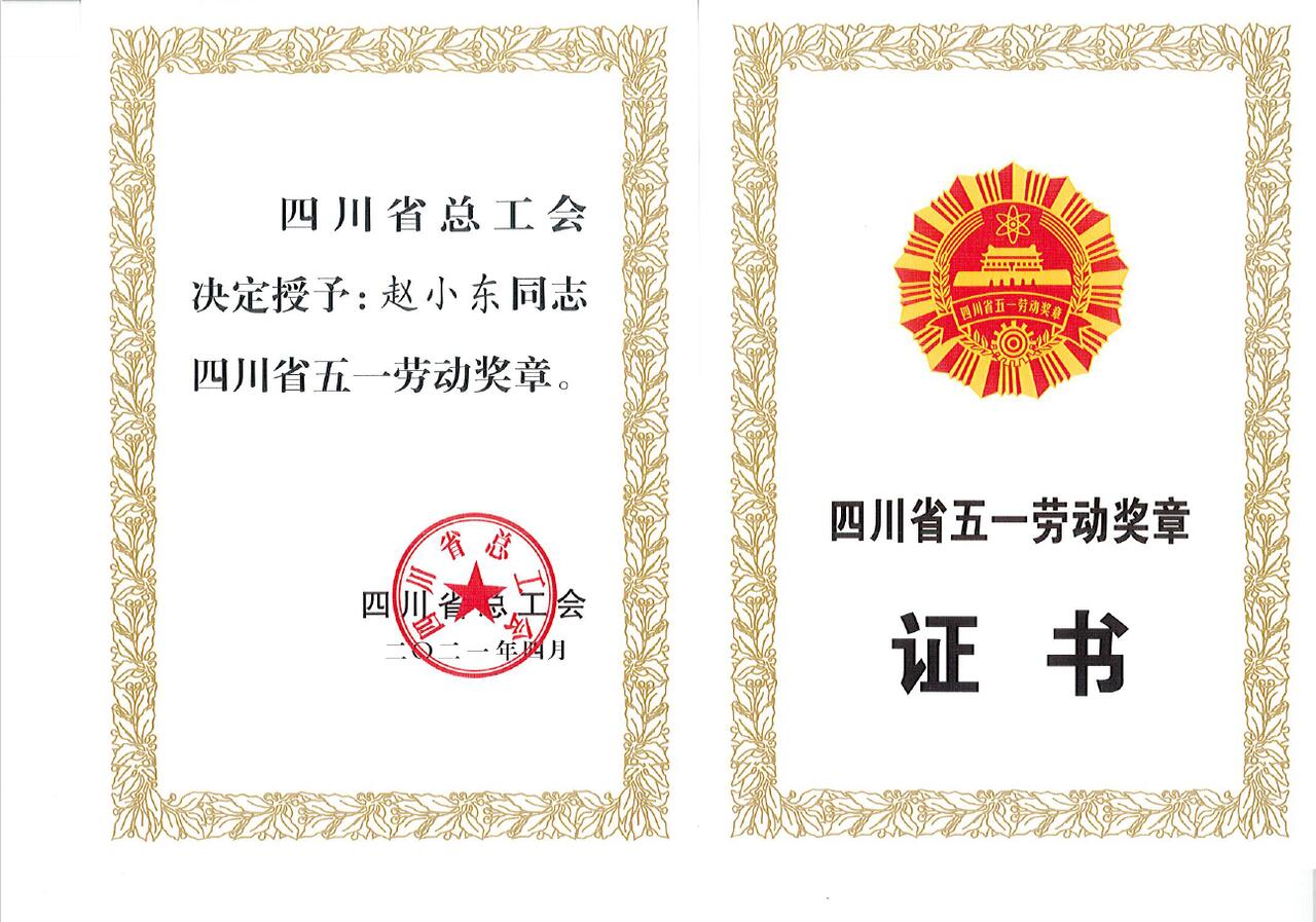 近年来,赵小东先后荣获内江经开区“拔尖人才”、内江市劳动模范、内江市优秀青年人才、四川省五一劳动奖章等荣誉。2023年4月,赵小东获全国五一劳动奖章。
