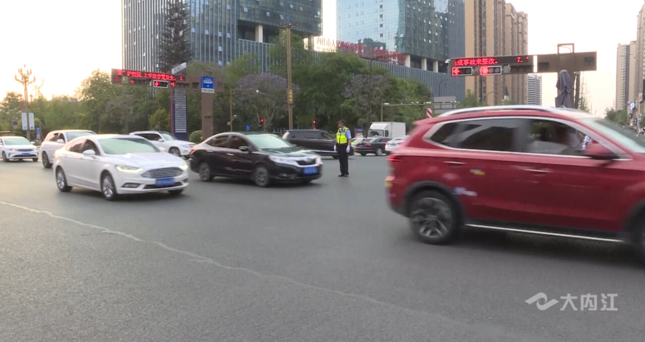 随着晚高峰和节假日车流人流的不断叠加,东兴区万达片区多个路口的车辆逐渐排起了长龙,为提高路口的通行效率,减少车辆排队的时间,内江交警粟鹏正忙着对现场交通秩序进行疏导。