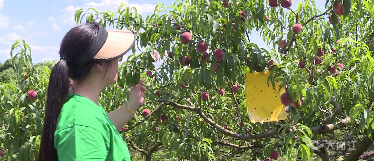 ▲基地负责人周璇曦查看桃子长势