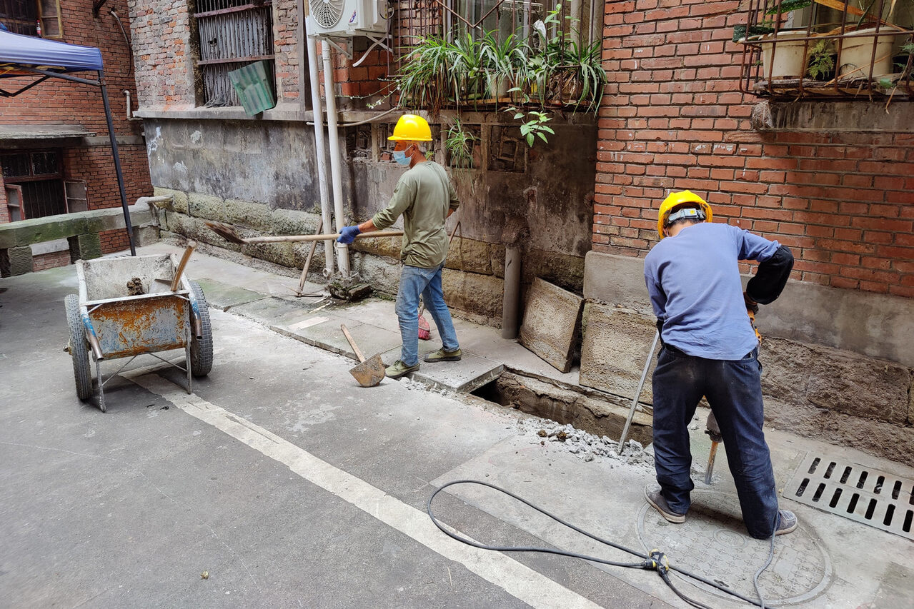 当天下午,紧临农贸市场的桂湖街小区楼下的改造现场,施工工人正在用钻头钻开排水沟,用铲子将里面的淤泥清掏出来。据桂湖街片区二期改造项目现场负责人刘国锋介绍,改造项目于2023年5月5日进场施工,改造范围涉及市中区城西街道12个小区。改造内容主要包括无障碍通道、栏杆扶手、梯间公共照明、休闲座椅等适老化改造,以及屋面防水治理、更换落水管、违建拆除等功能性改造,并支持有条件的住户加装电梯。