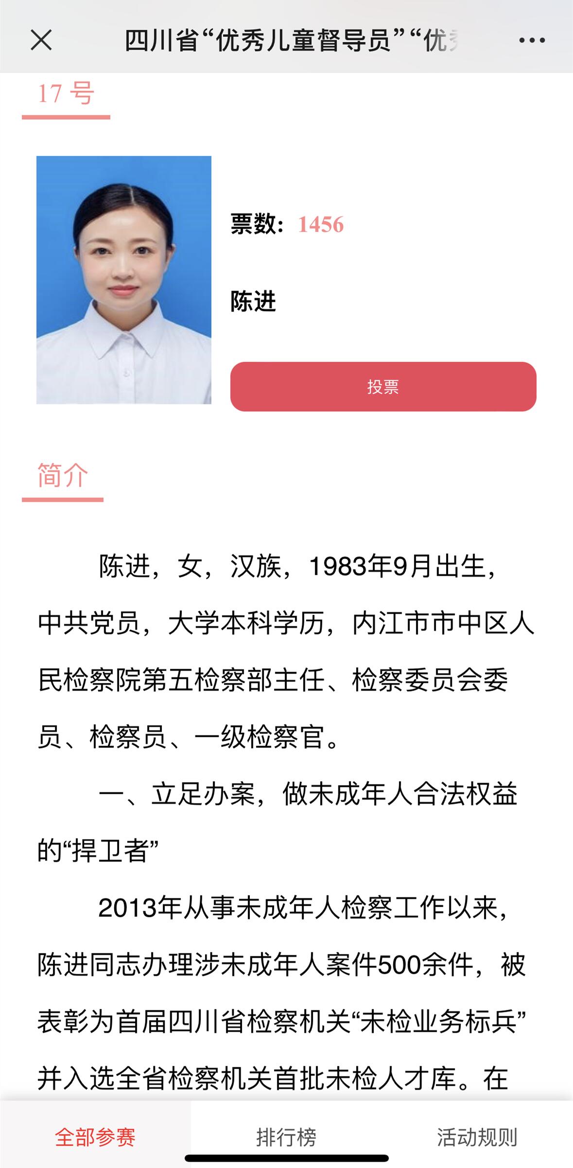 投票规则:本次投票分为优秀儿童督导员、优秀儿童主任、优秀残疾儿童护理员、优秀未成年人护航者四个类别,每人每天每个类别限投5票。