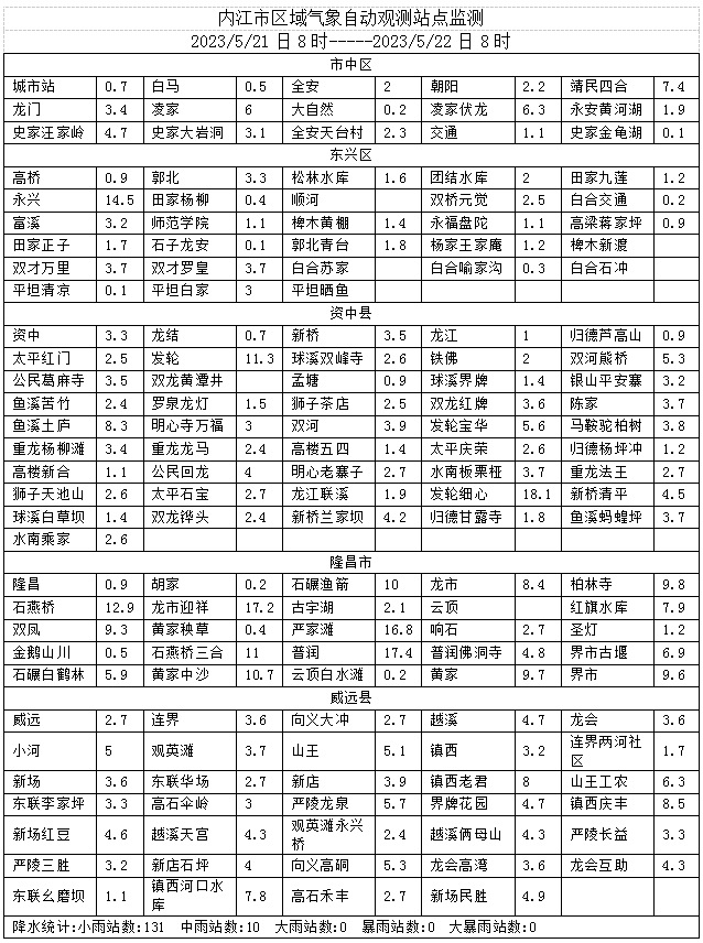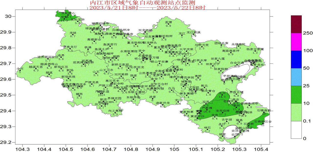 5月21日14时至22日8时,内江市出现了大风降雨天气过程,全市阵风达6级,其中威远县风力达7级,为13.9米/秒;雨量普遍小雨,局部中雨,全市148个观测站中10-25毫米10个,0-10毫米131个,最大降水出现在资中县发轮细心,为18.1毫米。