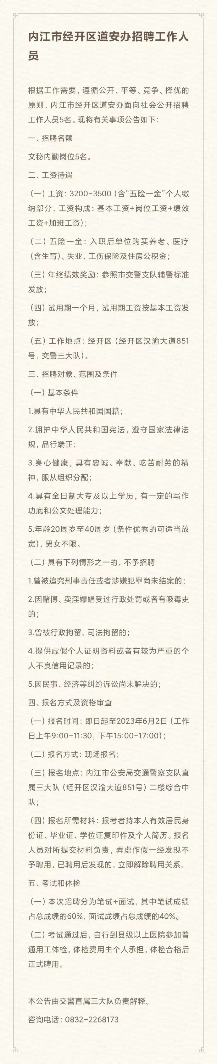 江粉儿从“内江交警三大队”微博获悉,内江市经开区道安办招聘工作人员,详情如下: