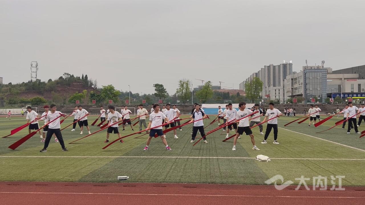 在内江市职业技术学院足球场,60名学生正拿着“船桨“聚集,时而做出划船动作冲刺,动作整齐划一,学生演员们情绪饱满,热情高涨。据了解,歌舞《众人划桨开大船》主要以60条桨片“同舟共济,万众一心”为寓意,并配合四名歌手的演唱来表达全国人民心往一处想、劲往一处使,齐心协力共创美好生活的决心。