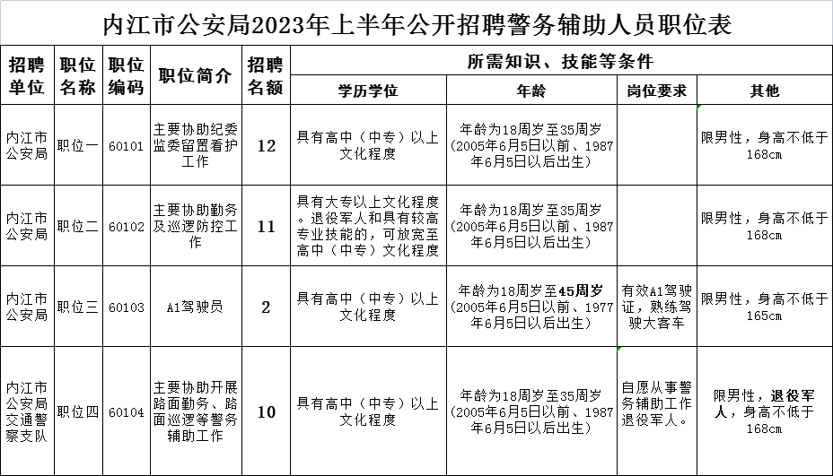 备注:2023年6月7日上午9点到10点,将在内江市公安局交通警察支队(地址:内江市东兴区汉安大道东段1888号),组织开展“戎耀归蜀”退役军人辅警专场招聘会,有意愿的退役军人可前往参加报名。