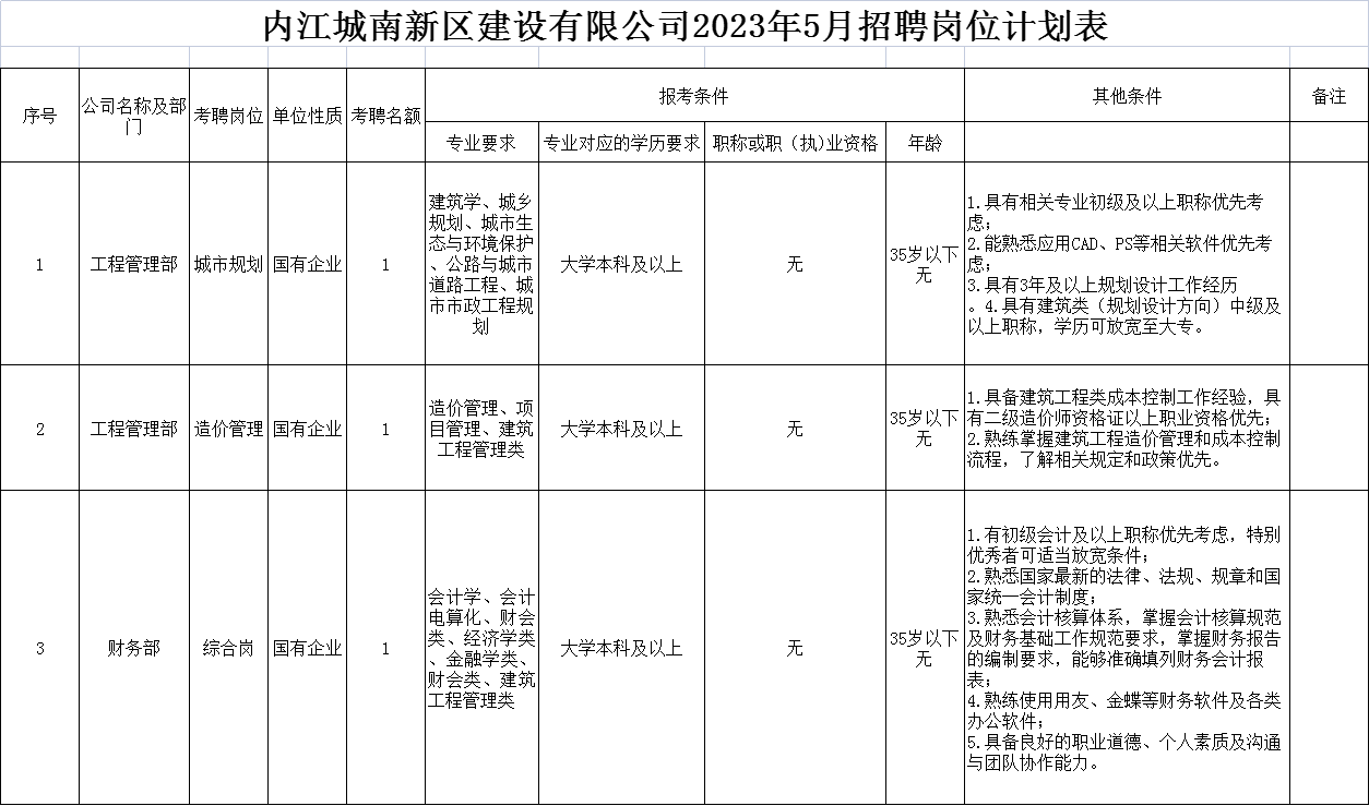 各岗位招聘要求详见《内江城南新区建设有限公司招聘岗位计划表》。
