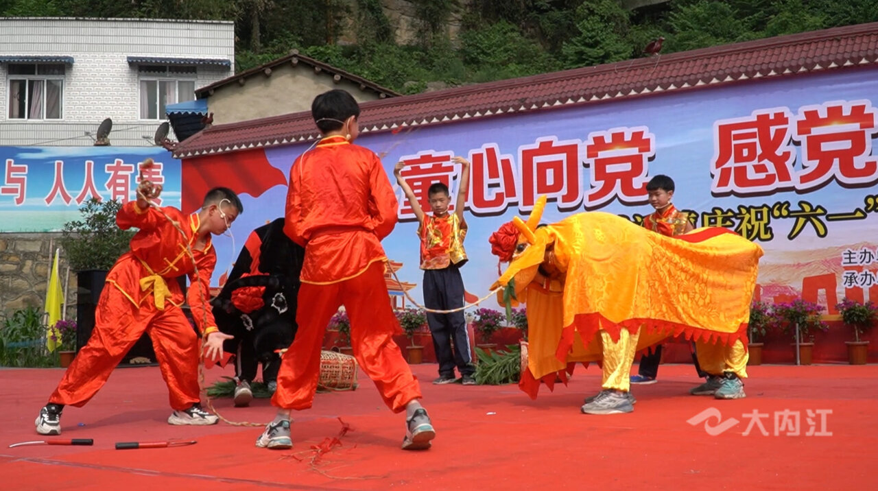 威远县越溪镇举办庆祝“六一”儿童节文艺汇演暨中小学生艺术节。孩子们用惟妙惟肖的表演把省级非物质文化遗产牛灯舞搬上了舞台。