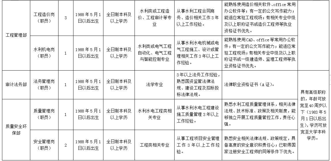 根据《四川省水利发展集团有限公司子公司人才引进管理办法(试行)》和《四川省向家坝灌区建设开发有限责任公司员工招聘录用管理办法》规定,结合公司工程建设及发展需要,拟面向社会公开招聘人才。现将有关事项公告如下: