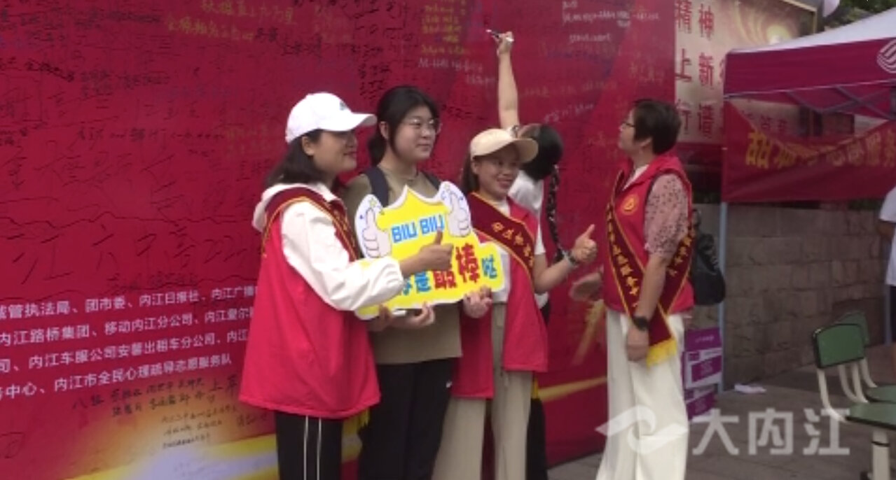 在内江六中兴隆校区门口考点外,公安、交警、志愿者们在积极的维护秩序。由志愿者协会设立的爱心墙上写满了寄语,不少考生在墙上签下了自己的名字,并合影留念,这在紧张的考试氛围里多了一份轻松,与此同时,在老师们的指引下,考生们有序的进入了考场,家长看着自己的孩子步入这没有硝烟的战场也久久不愿离去。