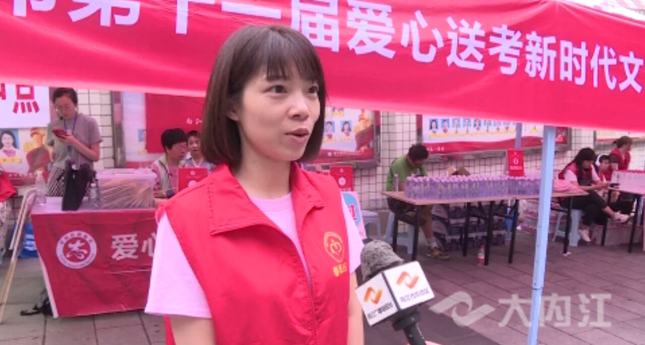 志愿者魏萍:“今天早上我们六点过就到这个考点来布置现场,为了能给考生提供一个更好的服务保障工作,也希望他们能考出好成绩。”