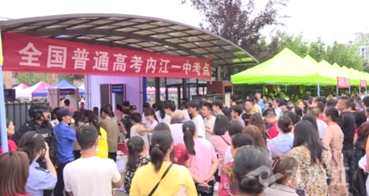 记者李小月:“今天是高考的第一天,在我身后就是内江二中的考点,大家可以看到,现场的公安,交警等相关部门工作人员都已早早地来到了考点外,执勤值守,精心做好考生服务工作,为平安顺利高考保驾护航。”