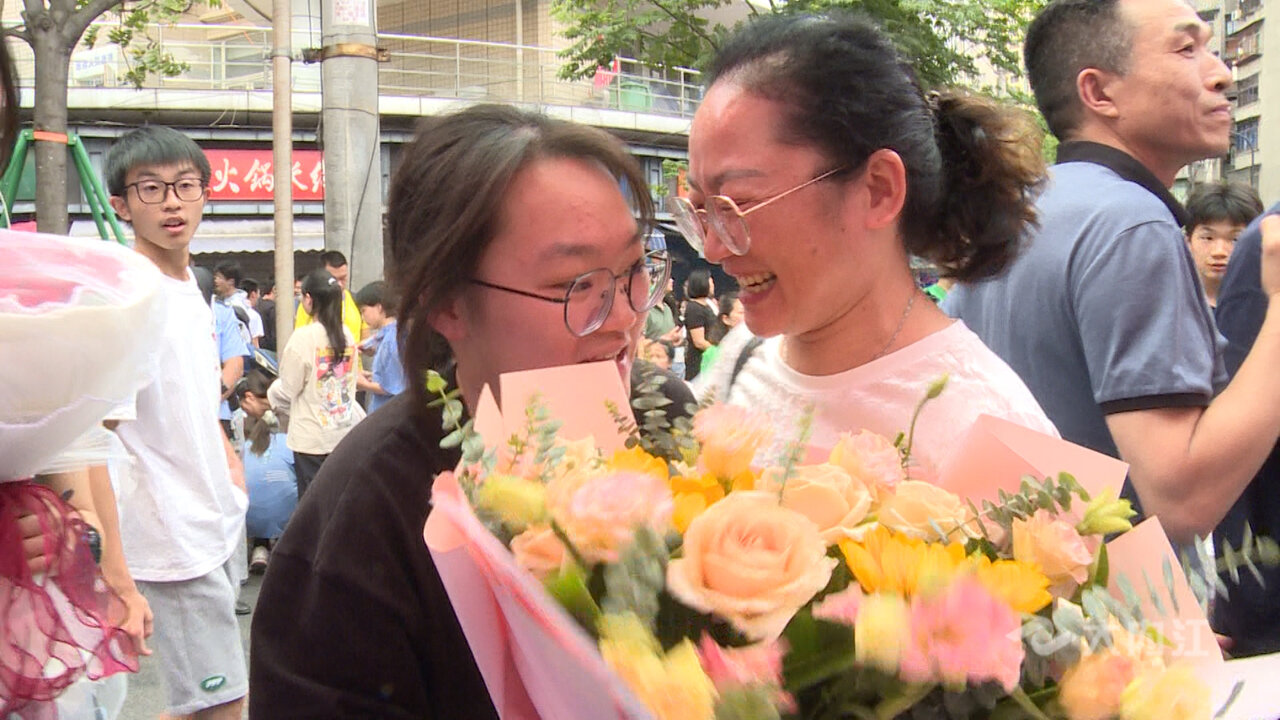 考生家长李万斌说:“我就希望给娃娃送一束花,(希望她)一举高中,以后遇到任何困难都直面(困难),认真去对待处理好每一件事情,祝她一路顺顺利利。”