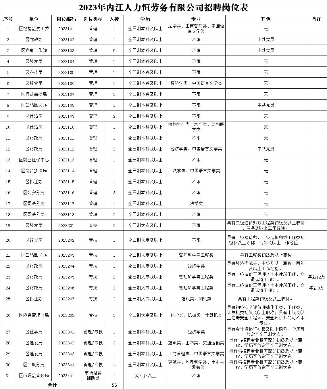 时间:2023-06-09 14:53:27 来源:内江人事考试网近日,江粉儿从“内江人事考试网”了解到,根据工作需要,内江人力恒劳务有限公司拟面向社会公开招聘56名劳务派遣人员到内江高新区管委会工作,详情如下: